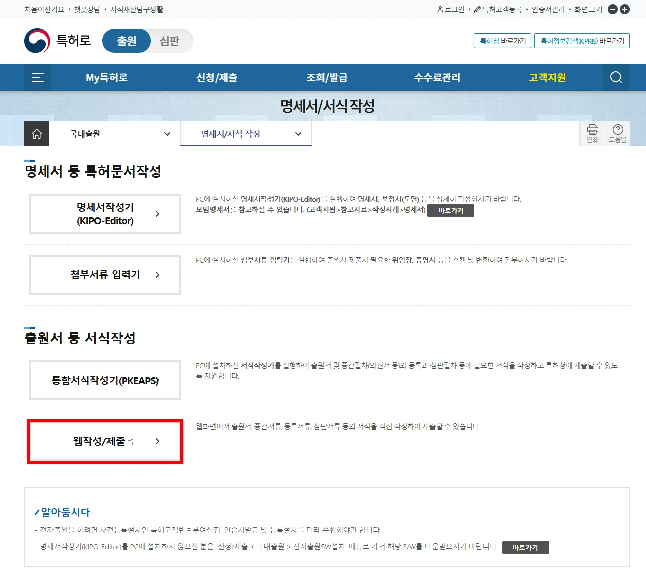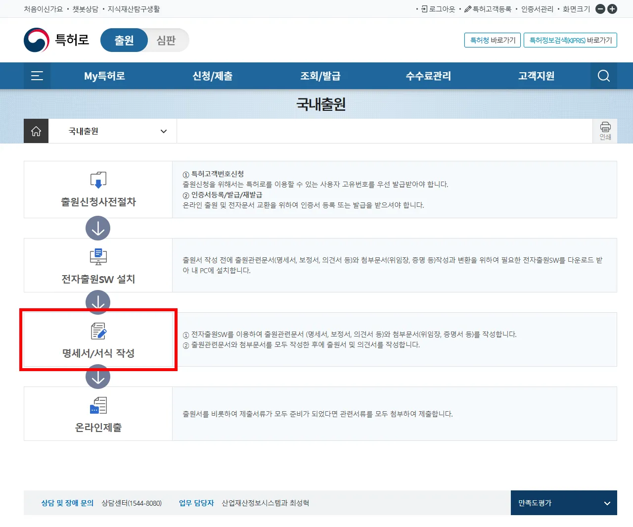 - 국내출원 메뉴에서 명세서/서식 작성을 선택합니다.