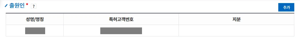 특허고객등록을 완료했다면 출원인 정보가 자동으로 표시됩니다. 공동출원을 원하는 경우 추가 버튼을 클릭하여 다른 출원인을 포함시킬 수 있습니다.