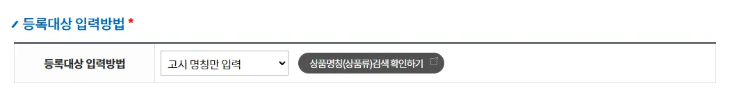 두 가지 입력 방식 중 상표 초보자에게는 '고시 명칭만 입력' 방식을 권장합니다: