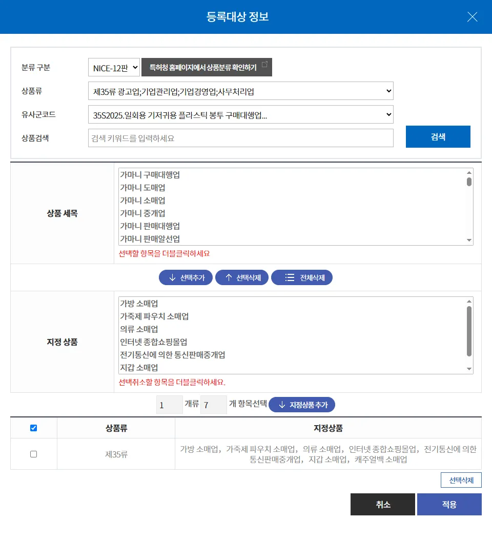 - 고시 명칭만 입력: 특허청이 미리 정해놓은 표준화된 상품/서비스 명칭 중에서 선택하는 방식으로, 오류 가능성이 적고 심사가 신속하게 진행됩니다.