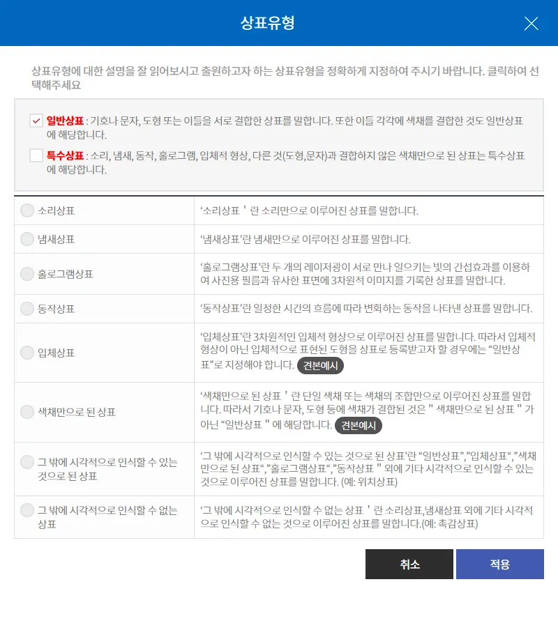 - 일반상표가 선택된 채로 적용 버튼을 누릅니다. (이 글에서는 특수상표는 다루지 않습니다.)