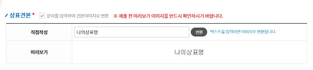 문자 상표의 경우 상표 견본이 없어도 제출이 가능합니다. '문자를 입력하여 견본이미지로 변환' 항목에 체크 후 직접작성 부분에 상표명을 입력하고 변환 버튼을 눌러 생성된 이미지를 미리보기 부분에서 확인한다.