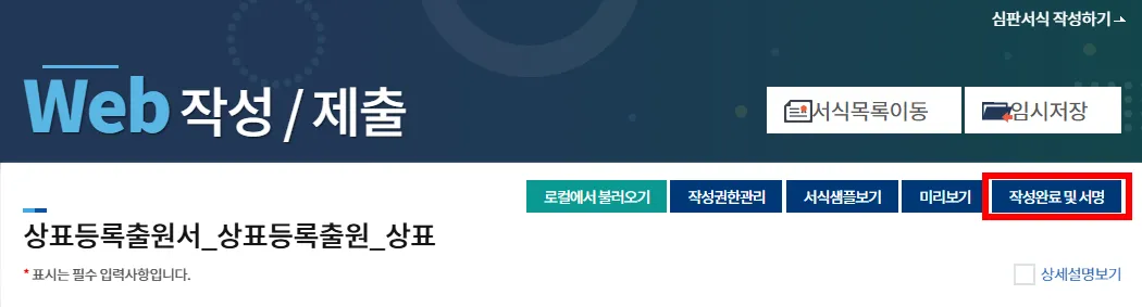 입력 사항에 이상이 없으면 화면 상단의 작성완료 및 서명 버튼을 클릭하여 제출을 완료합니다. 서명에는 공동인증서가 필요하므로 미리 준비해 두세요.