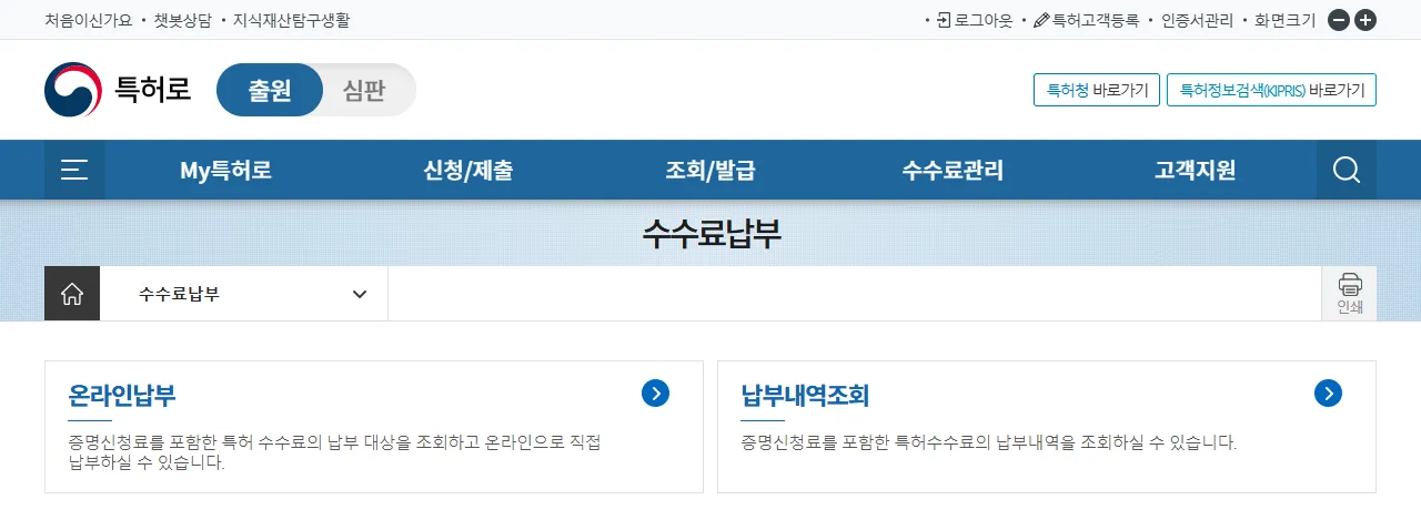 출원서 제출만으로는 절차가 완료되지 않습니다. 지정된 수수료를 납부해야 정식 출원으로 인정됩니다.