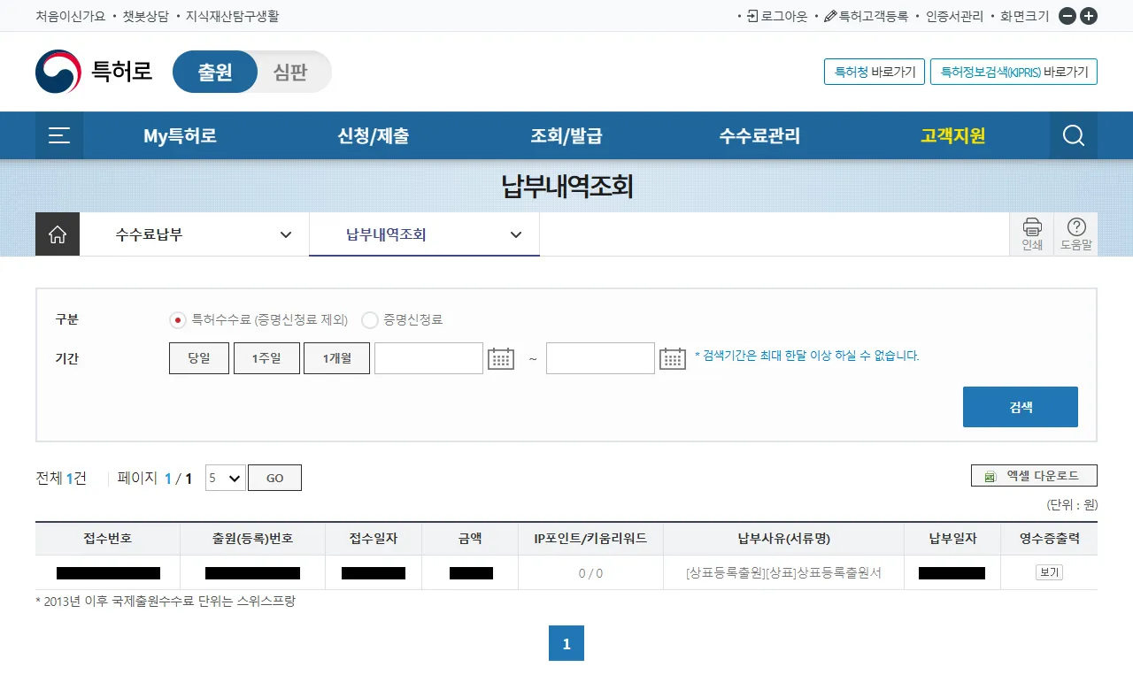 - 상표가 납부 목록에 표시되지 않는다면, 납부대상이 특허수수료로 선택되어 있는지 확인하고 검색을 다시 시도해 보세요.